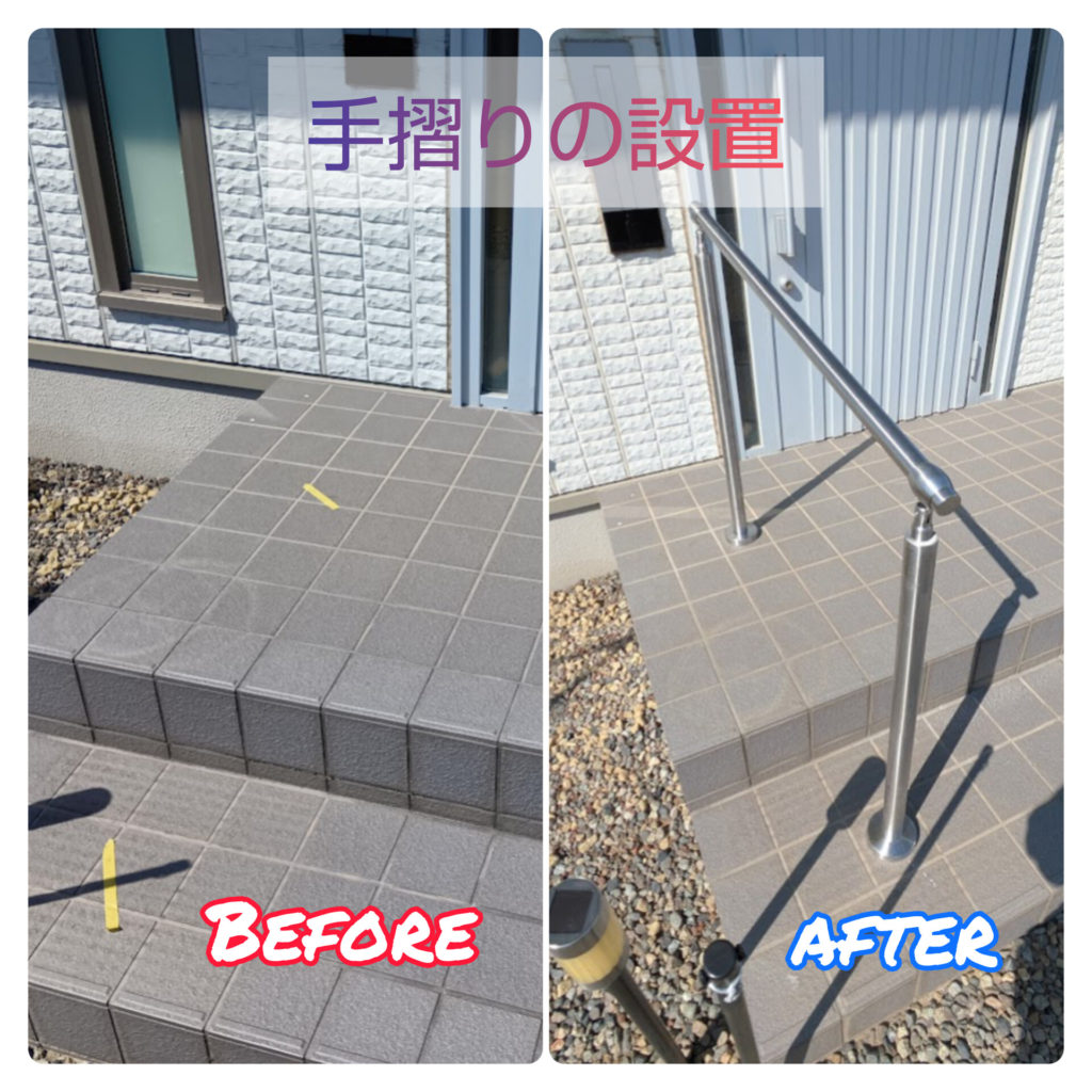 今回は、お外に設置でしたがお家の中に手摺を付けたいというご希望も承っておりますので