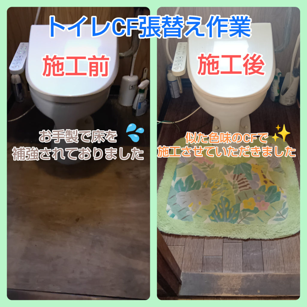 お盆でお孫様が帰省されるという事で、新しく床を剥がし合板、間柱、垂木も交換させていただいたのち、クッションフロア仕上げにてご提案させていただきました。