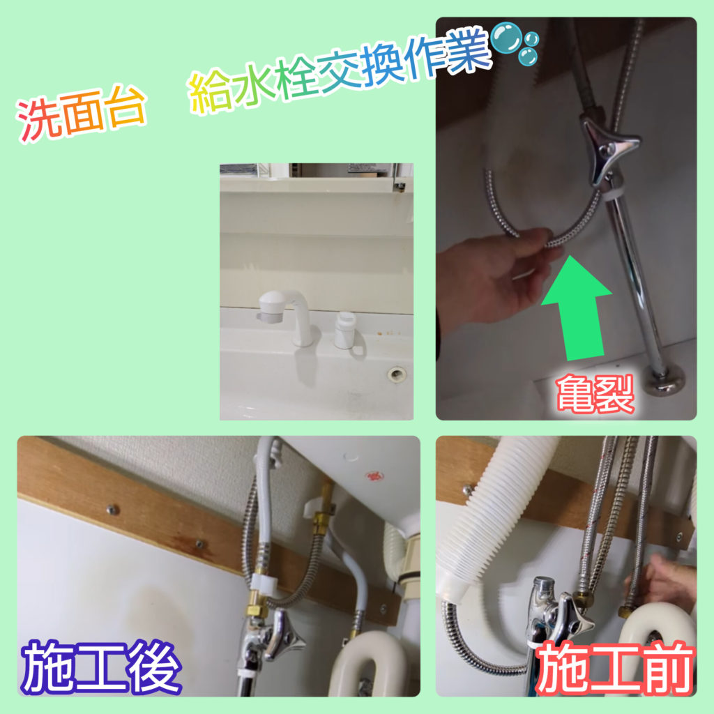 今回、洗面台の水漏れのご相談をいただき、給水栓の交換作業を行いました。
